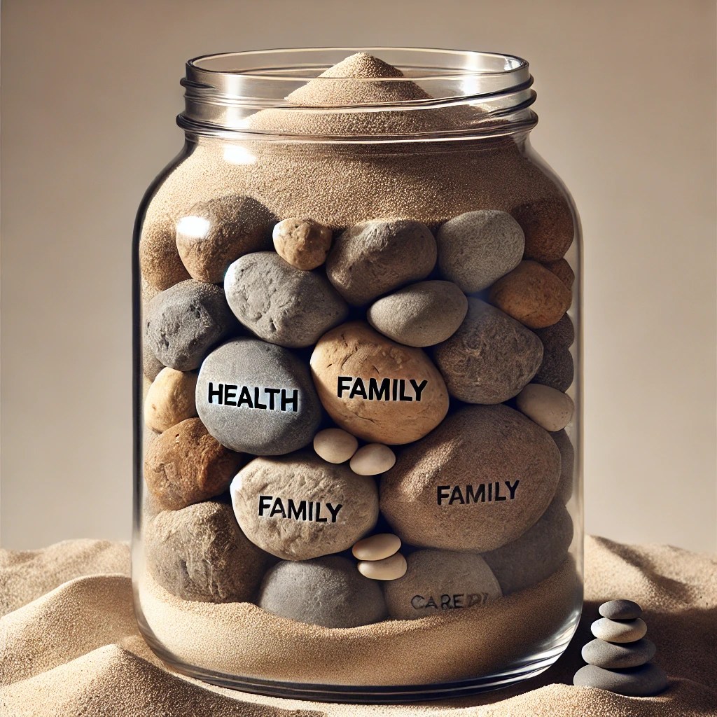 If you start by filling the jar with sand, there’s no room for rocks. But if you place the rocks first, the pebbles can fit around them, and only then can you add a little sand.